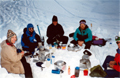 It takes several hours to build an igloo. It requires cutting big blocks with a snow saw, lifting them up and placing them in an upward ascending spiral, close the top, build an entrance and seal cracks between the blocks. Finally, some interior decoration: Flattening the floor for a comfortable sleep, building small shelves for candles, and placing a ground mattress, thermarest, sleeping bags and arranging personal paraphenelia. For all this work it would be best to stay longer than one night, but we did it mainly for the practice.
