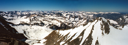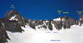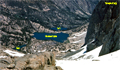 It was an El Nino year with lots of snow which lasted well into the summer. In July I wanted to get another ski mountaineering trip in, but everyone seemed to be heading for the beaches. So I decided to do a solo trip to the Palisade Range to ski the glacier and to climb Mt Sill, an SPS mountaineers peak. On 7/11 I hiked from Glacier Lodge on the trail along the North Fork of Big Pine Creek toward Sam Mack Meadows. The pack was loaded with skis, telemark boots, a rope and some climbing gear. I was glad when I reached Sam Mack Meadows to set up camp. Early next morning the full moon set over the mountains with snow illuminated by the first red morning light. A great day for skiing and exploring was starting. The peak climb would be better after a day at altitude. So I skinned up the col to the Thunderbolt Glacier and skied toward Mt Winchell. A snow field reached almost half up the mountain and it was fun to ski the slopes of Winchell. There were deep suncups and I was glad to have carried up my fat skis which nicely sliced through the suncups as they softened in the intense sun light. I skied west to a col between Winchell and T-bolt and had a fine view over Dusy Basin all the way to the Black Divide. At the lower end of the glacier a green-blue lake of ice water had formed. The colors were stunningly beautiful. In the afternoon the snow got very soft. Travel on skis was no problem. But some climbers returning from an ascent of Thunderbolt said they got stuck in soft snow and were totally exhausted from deep postholing. Another reason for a very early start. On Sunday morning I left before daylight, cramponed up the chute, traversed the Palisade Glacier and ascended Glacier Col below Sill and Gayley. The snow on the North Couloir was firm and it was a fine snow climb on a comfortable 35 deg angle. Then it turned into a rock climb up the northwest face over to the west ridge and the summit. No rope was needed but I was glad to have it on a first ascent of a cl 3-4 route. It was great to be on the summit of this high mountain. There is an unobstracted 360 deg view of the surrounding Sierra Nevada. Since it was a clear day one could probably see hundreds of peaks. In mid July the north facing slopes were still all white due to the El Nino this year. It is always fun trying to identify peaks, especially those which one has climbed before. No problem with the nearby ones like North Pal, Thunderbolt, Winchell, Norman Clyde, Mid Pal, Gayley, Temple Crag, Split, Birch, The Thumb, etc, and the widely visible Mt Goddard and Kaweahs in the distance. After enjoying the summit stay, it was time for a careful descent, especially on the class 4 section. No rope needed if one is careful. The snow in the North Couloir began to soften up but postholing started at lower elevation. Upon return to Sam Mack Meadows, I packed up and hiked out. A few hours later the nice trip was over and I cruised home on the 395. Skiing on the Palisade Glacier was so much fun that I thought of scheduling an SMS trip next year. Indeed, we had another fun Palisade Glacier trip in 1999.