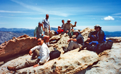 Angora and Coyote are at the southernmost end of the Great Western Divide. These peaks make a fine trip in spring time. An SPS trip was led by Harvey Ganz and Randall Danta with 6 participants. Since the distance is significant it was an overnight trip over the Memorial Day weekend in 2001. The weather was beautiful. The most scenic area was the Coyote Ridge. There were still significant patches of snow which slowed down the hiking. A slow leader and a fast hiker expressed their emotions but were appeased by Randall. We all made it up to Angora Peak and enjoyed a fine view on a splendid day. |