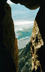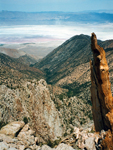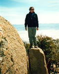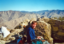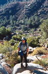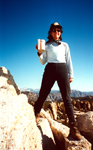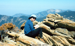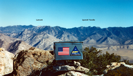 I found many pictures of former peak climbing trips which may be entertaining or even useful for others planning similar hikes. Otherwise they would fade into oblivion. Most of them are from former listed or private peak climbs throughout the Sierra Nevada. I have ordered them roughly by regions but do not claim completeness or all SPS peaks, just showing some selected cases. Short trip descriptions are added from memory or other write-ups. All old pictures are scanned photographs, hence do not have the same quality as the present digital pictures. The southernmost SPS peak is Pilot Knob South, accessible from Hwy 178 between Canebrake Rd and Onyx. One had to ask for permission to pass through Indian Reservation territory. In later years the owners denied access and the peak is now no longer on the SPS List. The peak is still accessible if one makes a long XC trip from the north. It was a very easy day climb. SMS member Susan Livingston also "collected" SPS peaks and accompanied me on Nov. 8, 2000. We passed through the farmer's land and thanked them with some sweetness from the city, then ascended a long gully to the ridge. The summit boulder was an easy climb. The peak register went back to 1957. It had mainly signatures of List afficionados. The view was nice but it felt more like a desert peak than a Sierra peak. Still it was fun for a day. |