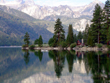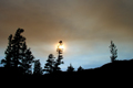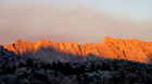 In the evening a dark brown cloud moved through the area: It was smoke from a forest fire in the western Yosemite N.P. It caused a reverse sunset where the top of the mountains darkened first and the base last. The shades were red-brown. After an hour the cloud drifter elsewhere and the sun rose again. At the real sunset the Sawtooth Range turned red and the peaks reflected in the lake.