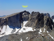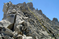 Since the snow had deep suncups it was safe to ascend it without ice axe and crampons. From the high point of the ridge one ascends the north face of the mountain aiming for the gap between two high points the right one of which is the summit. It is enjoyable class 2-3 climbing. By 11:30am we were on the summit. This time, we were lucky with a register. A 1941 Sierra Club box contained half a dozen of bound and spiral notebooks, loose sheets and business cards.
