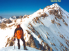 On Wed, 5/3, we got up at 5:45 am to another cloudless day. After the usual morning business we began our ascent to Triple Divide Pass (12,210') by 8 am. Three of us skied with "harscheisen" and reached the pass by 9 am.