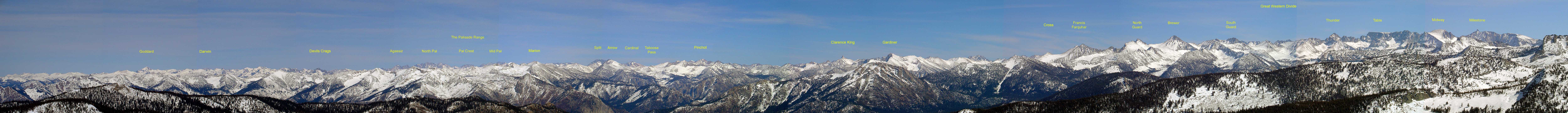 Put mouse over image to stop scrolling Panorama of the Sierra Nevada from Twin Peaks on the Silliman Crest. Photo by Reiner Stenzel. Back to trip report