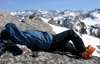 We set up camp at the shore of one lake with wind shelter from some trees. This would be our basecamp for two nights. We had a great view of snow covered slopes, the impressive NE face of Mt Silliman, and a view over the San Joaquin Valley with the Coastal Range at the horizon. The Central Valley was covered by clouds, while we enjoyed sunshine. After our 3100' climb with full packs we relaxed in the late afternoon and started an early dinner in the snow kitchen. In the evening there was a great sunset, which lit up the mountains and the thin clouds in the western sky. The wind picked up at night and we went to bed early.