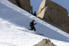 We inspected the steep rock face and found something like a cl 3 route just west of the summit. It was a mixed snow and rock climb. First we ascended a steep snow field with "skiers ice axes" (poles without basket inserted up to the handle into the snow), then did some rock climbing including a short chimney ascent with telemark boots, and suddenly were on the summit. Again a superb unobstructed view of endless mountains and valleys.