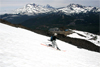 The lifts did not operate and the place was deserted. After hiking and skiing up for an hour we broke through the cloud layer, had blue sky and a wonderful view of white volcano summits poking through the clouds. We skied/climbed to the summit and fully enjoyed being up there. To the south we saw white peaks in the Crater Lake's area which would be our next destination. Even McLoughlin looked white on its north face. Most of us skied down the black diamond runs. The snow was excellent although one had to watch out for rocks. At the lower part of the mountain the snow was soft and the sticky coating under the skis again slowed us down.