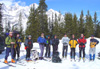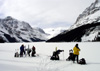 The scenery was spectacular: High mountains to the south, the rugged President Range to the west, and Sherbrooke Lake over which we would have to ski out was deep below us in a valley. We had a great run down the open slopes until the tree line. Then it was survival skiing again, sharp turns in a dense forest, bumpy narrow trails next to an open stream, but everyone made it safely. We skied across Sherbrooke Lake, occasionally feeling the snow settling down by a few inches, but not breaking through the ice. Then there was a final bumpy, crusty, narrow trail down to the road that would be better luge run than skiing. By midday we had reached the Trans-Canada Hwy at West Lake Louise Lodge. The guides called the van and an hour later we were on our way back to Canmore, except for a lunch break in Lake Louise.