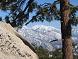 In this area the snow was melting and it was difficult to find continuous patches of snow to ski on. We then ascended up the other side past what looked like old rusty lift towers, and remnants of what looked like an old lift shack. The snow got more continuous. We reached the top of the ridge and came to the top of the rope tows for the Buck Horn Ski Area. We ducked under the running rope tows and continued across the ridgeline to our lunch stop, which had views south into the haze of el stinko.