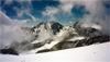 During dinner, I noticed a worrisome change in the sky: Dark stratus clouds moving rapidly in from the West. While the puffy clouds in the East usually dissipated at night the front from the West was a real snow storm. It started to snow at 8 pm and continued all night. Wind gusts rattled the tent. My greatest concern was the potential avalanche hazard on the steep Northern slopes of the Russell-Carillon col which I had to cross the next day. If necessary, I was ready to sit out the storm since I had supplies for seven days.