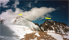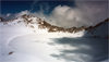 This is a genuine mountaineering experience involving a climb on 45 deg snow and rock with ice axe and crampons, complicated by a full pack with skis sticking high up. The snow had a firm base under about 1/2 foot of windpacked powder which did not slide. Luckily, there was no cornice at the pass. After about an hour of high-concentration climbing, the pass was reached with a big relief. This was probably the most tricky part of the crest tour. (In summertime the pass is straightforward).