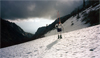 Barnard. The whiteout was dense and there were a few moments of doubt. Finally, by noon, we reached the chute. When the clouds opened for a moment, a steep wall of snow was visible. Don got worried. He felt that he could not handle it and what might come after this. I reassured him of his strong skiing (we had skied together Whitney's Trailcrest the year before) but could not convince him to go any further.