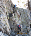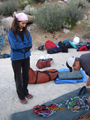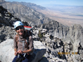 We started at 4:20a.m. on Sep. 2 at the end of a dirt road about 4-5 miles south of the Shepard pass trail head. We had a forth member that first day, too, Verdi. He retreated, though, at the end of the first day, just when we got to the northeast ridge, as we weren't able to find snow to make water by then. Unfortunately, just after he left, Scott located a hidden snow field via a rappel from the ridge. So, we 3 bivwacked in a spot used for previous bivwacks, perhaps even Ron Hudson in 2002! Aysel melted snow for drinking & made us tea; so nice. It was a lovely windless night, & a good thing, as neither Aysel nor I had sleeping bags. She had a bivwack bag, & I had a down parka & space blanket!