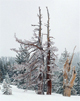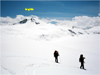 But we retraced our steps in time and enjoyed a wonderful powder run down to Buena Vista Lake, which we skied across. After crossing the saddle to the Horseshoe Ridge a yellow marker (#17, Merced Crest) was spotted, a first sign of "civilization". We skied up the Horseshoe Ridge only to find that it was heavily corniced. The usual descent at the east end of the ridge down to Heart Lake looked avalanche prone. The visibility was poor. So we decided to stay on top of the ridge and ski to its west end where we could descend on gentler, forested terrain and return to Ostrander Lake. We had a break in the weather and some welcome sunshine for an hour. Later we even got a glimpse of the Clark Range.